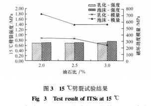 (3)在通常的瀝青用量范圍內 , 冷再生混合料 15 ℃劈裂強度指標對油石比的變化不敏感 , 但是劈裂破壞勁度模量隨油石比的增加而有所降低。這與熱拌瀝青混合料在常溫下的劈裂強度通常會隨油石比的增大、 瀝青膜的增厚而降低