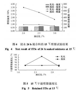(5)在 2 %~ 3 %這一通常油石比范圍內, 冷再生混合料浸水 24 h 后 15 ℃劈裂強度指標對油石比的變化不敏感, 但是劈裂破壞勁度模量隨油石比的增加而有所降低 , 這與未浸水的 15 ℃劈裂試驗結果是一致的。