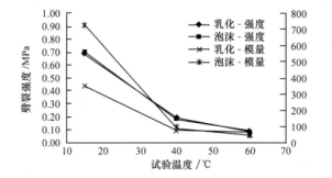 采用 2.0 %的油石比制備試樣 , 分別在 15 、 40 、 60 ℃條件下進行劈裂試驗, 試驗結果如圖 6 所示。從圖 6 中可以看出, 40 ℃和 60 ℃條件下, 泡沫瀝青冷再生混合料劈裂強度分別為 0.18 、 0.09 MPa , 僅為