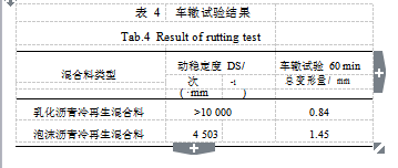 2.5 %的油石比, 分別制備乳化瀝青冷再生混合料和泡沫瀝青冷再生混合料試件, 進行車轍試驗 , 試驗結果如表4 所示。